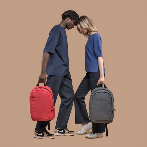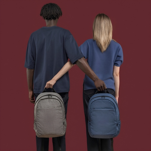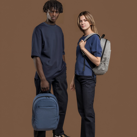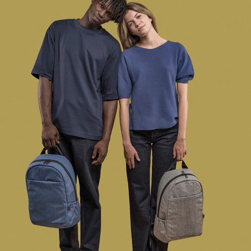 • Balo làm bằng vải mélange được sản xuất từ nhựa tái chế.