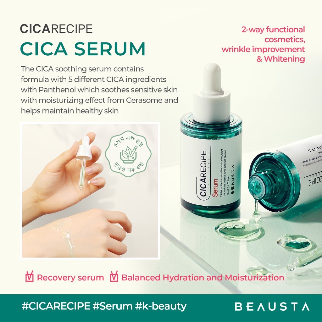 5 Loại Cica có trong Serum Beausta: Centella Asiatica Extract, Madecassoside, Madecassic Acid, Asiatic Acid, Asiaticoside,…giúp làm dịu da ngay lập tức, chăm sóc và bảo vệ làn da nhạy cảm trước tác động của bên ngoài. Khả năng cấp ẩm vượt trội giúp tăng cường sản sinh Protein và Collagen giúp tái tạo tế bào da từ sâu bên trong.