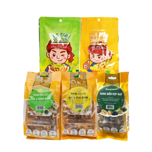 👉Rọng biển: Gạo lứt sấy (35%), hạt đậu phộng (17%), hạt điều (9.5%), rong biển (5%), hạt macca cắt nhỏ (5%), hạt bí xanh (5%), hạt mè (2.5%), glucose syrup từ bắp, muối, bột ớt.
