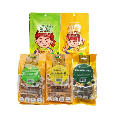 👉Rong biển kẹp hạt: Rong biển lá, gạo lứt, hạt điều,hạnh nhân lát, bí xanh, hạt mè, muối, ớt bột, dầu hào, đường isomalt