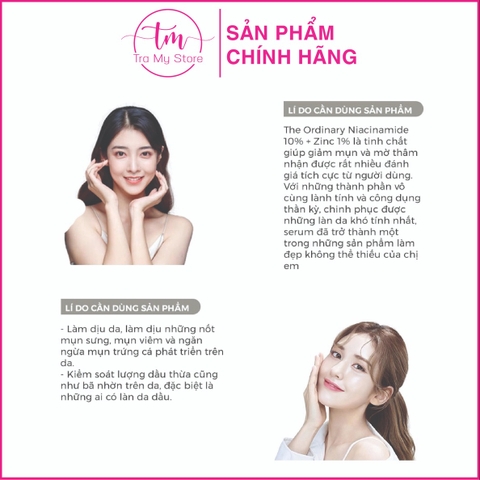The Ordinary Niacinamide 10% + Zinc 1% là tinh chất giúp giảm mụn và mờ thâm nhận được rất nhiều đánh giá tích cực từ người dùng. Với những thành phần vô cùng lành tính và công dụng thần kỳ, chinh phục được những làn da khó tính nhất, serum đã trở thành một trong những sản phẩm làm đẹp không thể thiếu của chị em.
