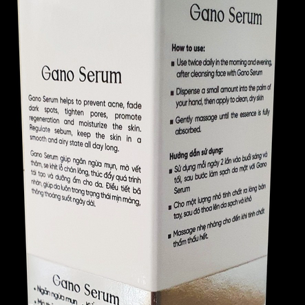 Gano Serum giúp ngăn ngừa mụn, mờ vết thâm, se khít lỗ chân lông, thúc đẩy quá trình tái tạo và dưỡng ẩm cho da. Điều tiết bã nhờn, giúp da luôn trong trạng thái mịn màng, thông thoáng suốt ngày dài. Công thức không chứa paraben. An toàn cho làn da dầu, mụn, nhạy cảm.