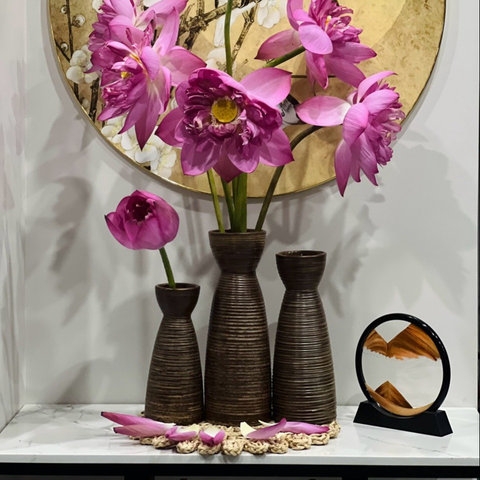 1 cái bình mộc dễ cắm , dễ phối hoa , dạng men sần đẹp mà nặng tay , nhìn ngoài đẹp lắm , nhà em về cả 3 sai để các chị lựa chọn . Nhưng giá rẻ này thì quất cả 3 sai luôn ah . Sai to nhất cắm tuyết mai , dơn lúa thì tuyệt vời . Sai vừa các chị cắm hồng , cẩm chướng . Sai nhỏ cắm mao lương nhẹ nhàng tuylip yểu điệu .