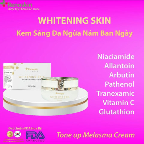 Kem dưỡng trắng sáng ngừa nám Whitening Skin với 7 hoạt chất vàng để điều trị và phục hồi làn da nám sạm cũng như trắng sáng da.