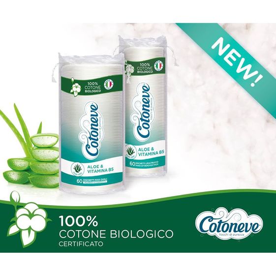- Bông tẩy trang hữu cơ chiết xuất lô hội và vitamin B5 Maxi Cotoneve với tinh chất lô hội và Vitamin B5 – dưỡng chất được đặc biệt đánh giá cao nhờ đặc tính làm mềm da, miếng bông thấm hút tốt và bề mặt bền chắc lý tưởng cho làn da mỏng, nhạy cảm hoặc có thể dùng để tẩy sơn móng tay. Thêm vào đó, quá trình xử lý đặc biệt làm đầy sợi bông, làm cho những miếng bông này đặc biệt mềm và siêu thấm.