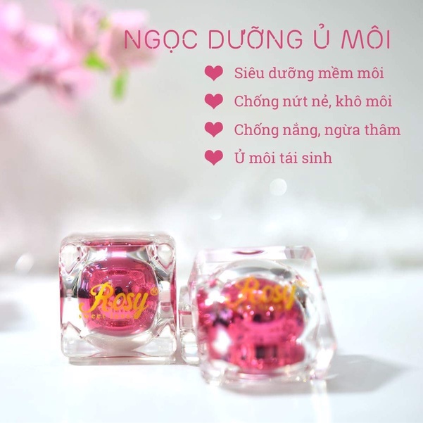 - Ngọc dưỡng ủ môi Rosy với thành phần 100% thiên nhiên chứa các dưỡng chất tuyệt vời dành cho đôi môi, dưỡng môi mềm ẩm, hồng hào và chống lão hóa cho đôi môi.