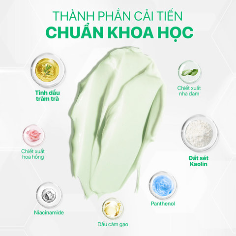Công thức độc đáo ngừa mụn thông qua cơ chế loại bỏ dầu thừa, bụi bẩn, giúp làm sạch lỗ chân lông nhờ tác động của đất sét Kaolin & Salicylic acid, từ đó giúp đào thải mụn ẩn. Bên cạnh đó, nhờ vào công dụng ngừa khuẩn và ngừa viêm của tinh dầu Tràm Trà giúp làm lành vết thương sau mụn, hỗ trợ giảm mụn, và ngăn ngừa mụn mới phát sinh. Đặc biệt, bổ sung thêm các chiết xuất, vitamin, và dầu dưỡng giúp hỗ trợ làm sạch da, dưỡng sáng da tự nhiên, giúp da mềm mịn, khỏe đẹp.