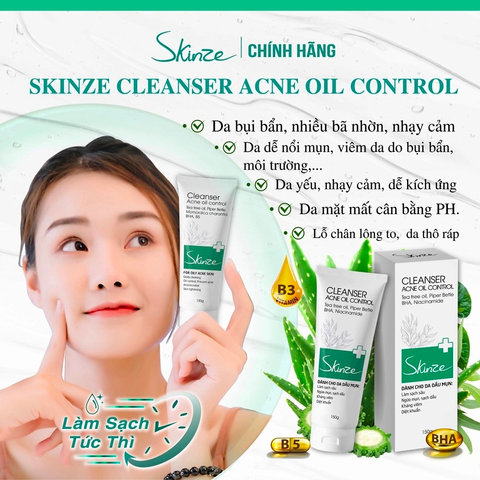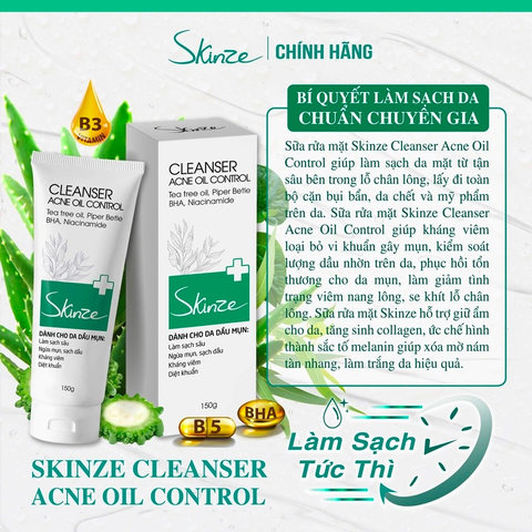 Sữa rửa mặt Skinze Cleanser Acne Oil Control giúp làm sạch da từ tận sâu bên trong lỗ chân lông, lấy đi toàn bộ bụi bẩn, da chết và mỹ phẩm trên da. Sữa rửa mặt Skinze Cleanser Acne Oil Control giúp kháng viêm loại bỏ vi khuẩn gây mụn, kiểm soát lượng dầu làm ẩm trên da, phục hồi tổn thương cho da mụn, làm giảm tình trạng viêm nang lông, se lỗ chân lông. Sữa rửa mặt Skinze hỗ trợ giữ ẩm cho da, tăng sinh collagen, ức chế hình thành sắc tố melanin giúp xóa mờ nám tàn nhang, làm trắng da hiệu quả.