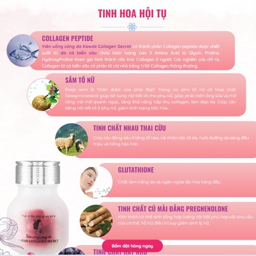 - Sở hữu công thức được phối trộn hoàn hảo, Kawaii Collagen Secret chứa 500 mg collagen peptide gốc cá 100 % nhập khẩu từ Nhật Bản với độ tương thích lên tới 90%, 40% Glutathione , 50 mg chiết xuất sâm tố nữ , 20mg chiết xuất từ củ mài đắng , 200IU Vitamin E , Biotin và Sữa ong chúa . Chỉ trong 1 viên được bổ sung, Kawaii Collagen Secret cung cấp mọi thứ da cần để tiến hành quá trình trẻ hoá một cách toàn diện nhất: