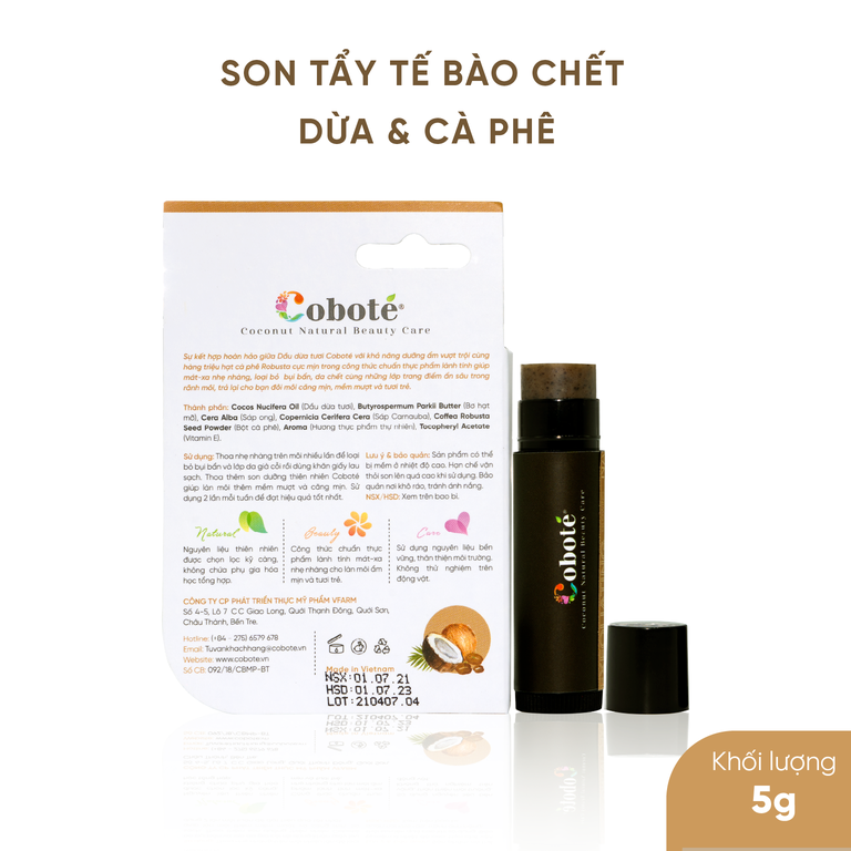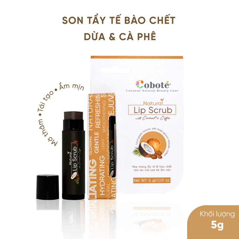 -Son tẩy tế bào chết cà phê Coboté là sự kết hợp hoàn hảo của Dầu dừa tươi 100% có tính dưỡng vượt trội và hàng triệu hạt cà phê Robusta cực mịn thay thế các hạt vi nhựa hiệu quả trong việc cuốn trôi lớp da chết, bụi bẩn và vết son ẩn trong các rãnh môi trả lại đôi môi mềm mịn, hồng hào và tươi trẻ