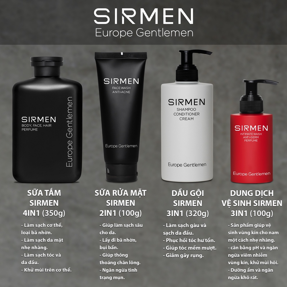 - Sữa tắm gội nam 4 in 1 hương nước hoa châu Âu Sirmen Europe Gentlemen dòng cao cấp 350g chiết xuất tự nhiên công nghệ EU-Nano đậm đặc gấp 2 lần.
