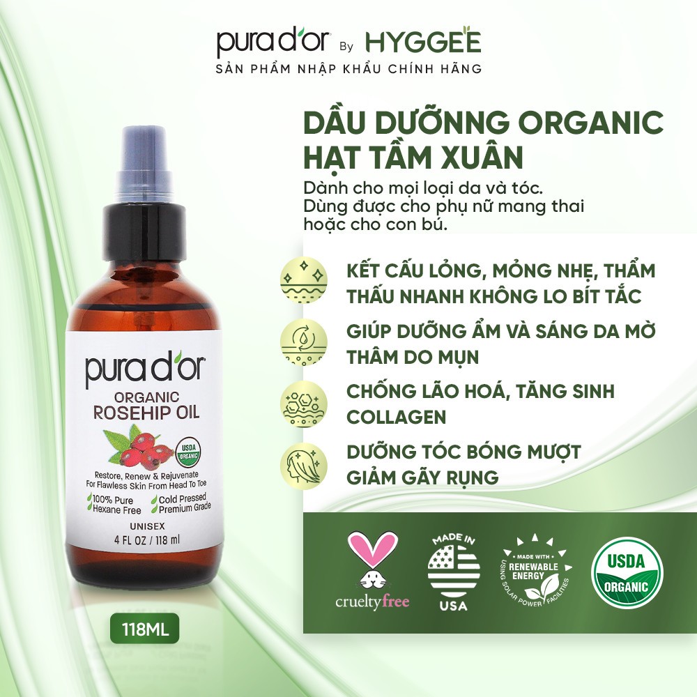 Dầu hạt tầm xuân organic của Pura D'or đạt chứng nhận USDA Organic - Công thức hoàn thiện chu trình chăm sóc da, hồi sinh làn da lão hóa và giảm thiểu các nếp nhăn và tăng sinh collagen.