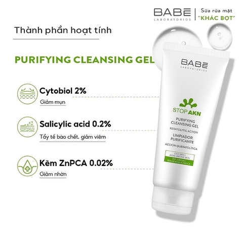 Sữa rửa mặt BABE Stop AKN Purifying Cleansing Gel 200ml là sản phẩm đặc biệt dành cho da dầu mụn giúp làm sạch sâu và giảm mụn trứng cá.