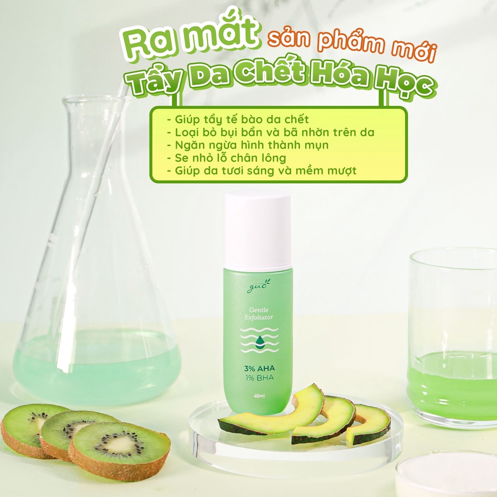 Tẩy da chết Gentle Exfoliate GUO AHA 3% & BHA 1% giúp mang lại các hiệu quả tuyệt vời cho làn da, nhẹ nhàng loại bỏ lớp sừng già cỗi trên bề mặt da mà không mài mòn hay gây tổn thương, thúc đẩy hình thành tế bào da mới mịn màng và tươi trẻ hơn. Cung cấp độ ẩm giúp giữ da mềm mại không khô căng. Sản phẩm giúp thẩm thấu sâu vào lỗ chân lông, giúp tăng cường loại bỏ tế bào chết và bụi bẩn, bã nhờn tích tụ, duy trì làn da thông thoáng, không bít tắc. Giảm mụn, viêm mụn và ngăn chặn quá trình hình thành nhân mụn