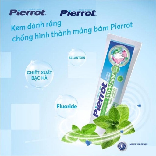 Kem đánh răng Pierrot chống hình thành mảng bám 75ML với fluoride giúp ngăn ngừa mảng bám, thức ăn thừa tích tụ sâu trong chân răng, chống sâu răng hiệu quả; allantoin giúp bảo vệ niêm mạc và tái tạo lại các tính chất ban đầu của răng, cho răng trắng sáng. Chiết xuất bạc hà cho cảm giác sảng khoái với hơi thở thơm mát dễ chịu.