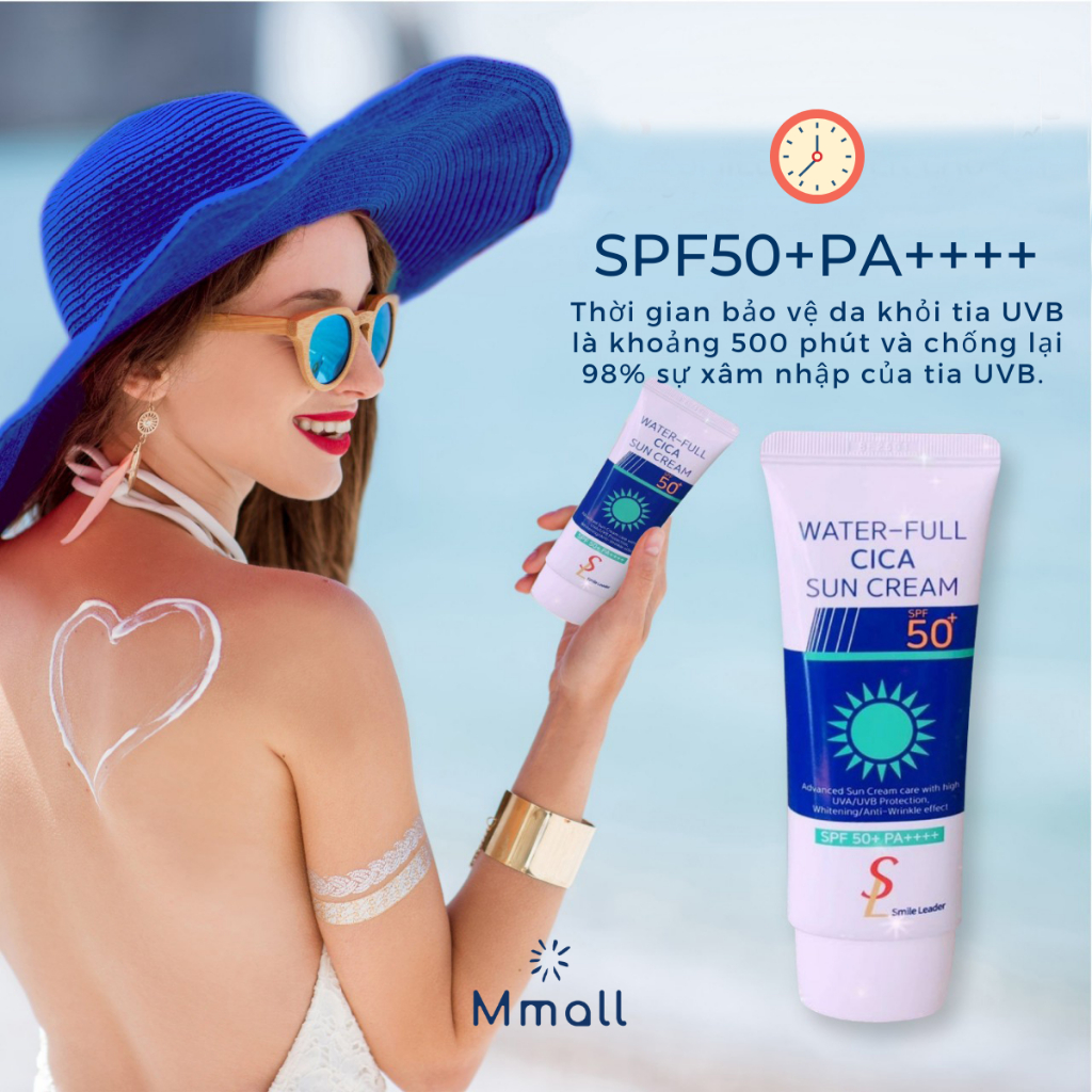 THÔNG TIN SẢN PHẨM: 🌞Tên sản phẩm: Kem Chống Nắng Smile Leader 🌞 Xuất xứ: Hàn Quốc 🌞 Thương hiệu: Smile Leader 🌞 Dung tích: 60ml 🌞 Dòng kem chống nắng Smile Leader Water Full CICA SunCream có 3 loại, thích hợp cho từng loại da: da dầu, da dầu mụn, da khô, da nhạy cảm,... kể cả cho mẹ bầu và đang cho con bú. ☀ Kem chống nắng Water Full CICA SunCream màu xanh: Kem chống nắng cho da dầu, cấp ẩm, nâng tone ☀ Kem chống nắng Premium Anti UV SunCream màu cam: Kem chống nắng cho da khô, chống lão hoá, nâng tone ☀ Kem chống nắng Leport Water Full Sun Cream màu trắng: thích hợp sử dụng khi ở ngoài trời, chơi các hoạt động thể thao nhờ khả năng chống thấm mồ hôi tốt. 🌞 Kem chống nắng Smile Leader chắc chắn sẽ làm bạn hài lòng với các ưu điểm nổi trội hơn hẳn so với các kem chống nắng thông thường: - Chất kem lỏng mịn, thoáng da, kiềm dầu không gây bết dính. - Chỉ số chống nắng toàn diện bảo vệ da tối ưu cả ngày dài với độ SPF 50 PA++++ - Kem chống nắng nâng tone, có thể thay cho lớp lót trang điểm. - Chứa các thành phần có khả năng làm trắng da, cấp ẩm, chống lão hoá, dưỡng da ngay trong quá trình sử dụng. 🌞 THÀNH PHẦN SẢN PHẨM: Sản phẩm có chứa các thành phần quý như: hoàng cầm, chiết xuất vỏ cây liễu châu âu , seed oil,... hoàn toàn từ thiên nhiên, an toàn, lành tính.