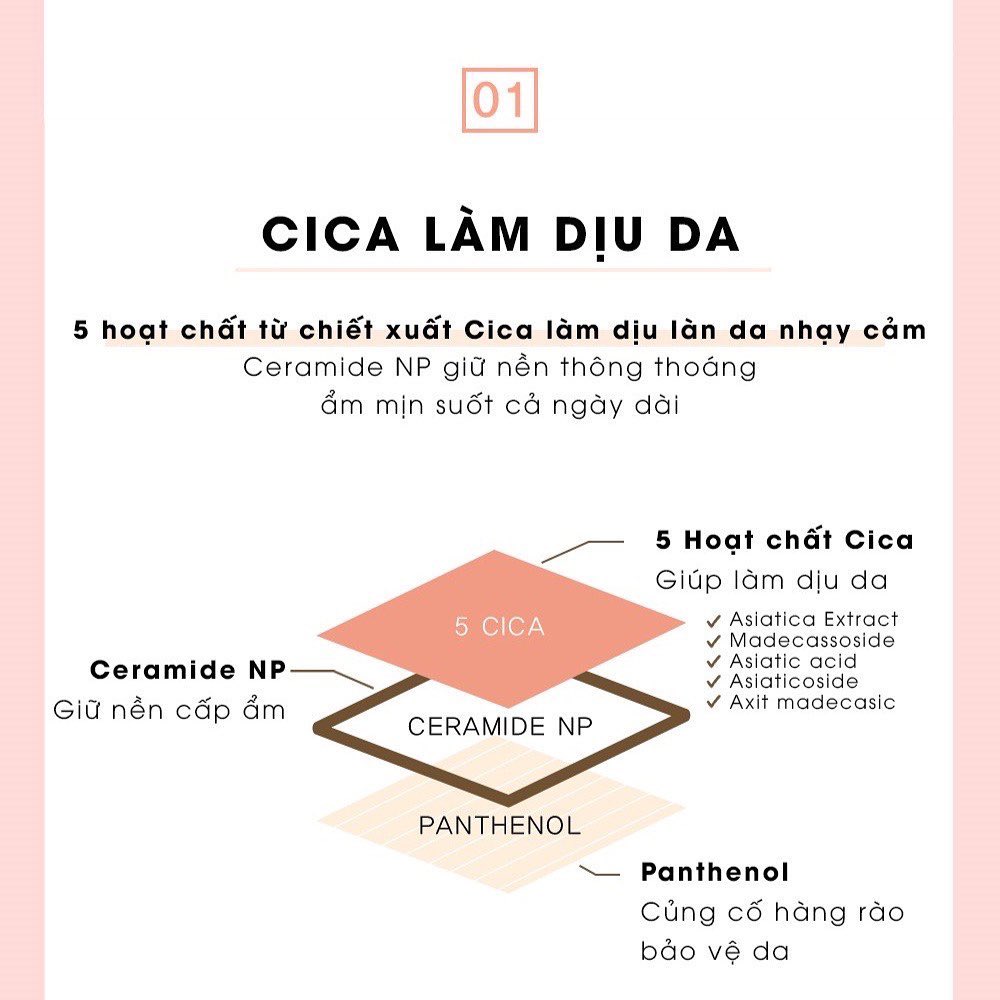 - Là một cushion có thành phần chính từ phức hợp rau má giúp làm dịu mẩn đỏ, kích ứng, châm chích da cùng Panthenol và Ceramide cải thiện hàng rào bảo vệ da, giữ da khỏe mạnh.
