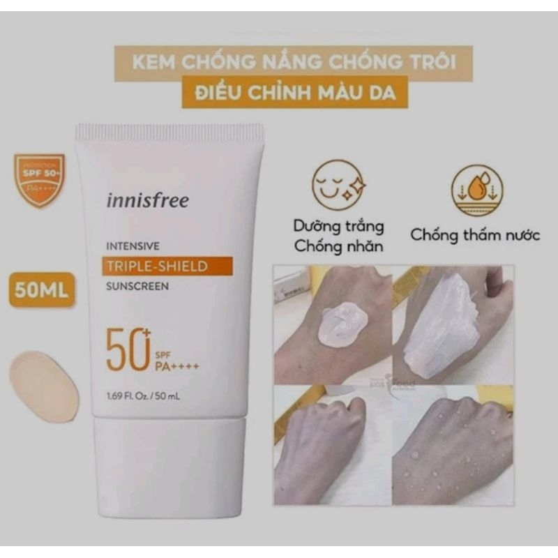 Kem Chống Nắng Innisfree Intensive Triple Shield SPF50 Sunscreen SPF50+ PA+++ là phiên bản nâng cấp của dòng Triple Care quen thuộc vẫn lên tông nhẹ nhàng. Có khả năng hỗ trợ chống lão hoá, cải thiện nếp nhăn, nám, tàn nhang do tia cực tím gây ra. Bổ sung Màng lọc khoáng nano giúp nâng tông nhẹ nhàng hiệu chỉnh tông màu da mà không gây bết dính, bóng dầu. Chống được ánh sáng xanh từ thiết bị điện tử. Thành phần chọn lọc không gây hại cho rạn san hô và hệ sinh thái biển.Loại da phù hợp: mọi loại da, kể cả da nhạy cảm