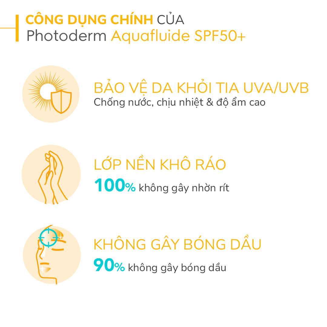 Photoderm MAX Aquafluide giúp bảo vệ da tối ưu khỏi tác hại của tia UV (cháy nắng, dị ứng ánh nắng mặt trời, v.v.) nhờ bộ lọc tia UVA/UVB kết hợp với khả năng bảo vệ sinh học từ bên trong độc đáo có trong bằng sáng chế Cellular Bioprotection™. Bằng sáng chế này giúp kích hoạt chức năng phòng thủ tự nhiên, bảo vệ tế bào và ngăn ngừa lão hóa da sớm. Kết hợp thêm 3 loại phấn kiềm dầu giúp da khô thoáng và mịn màng.