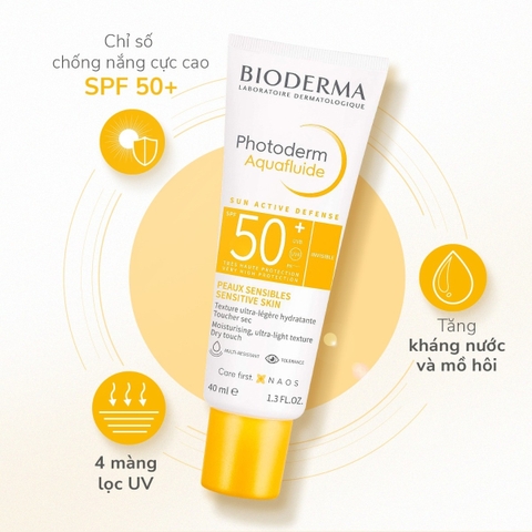 Kem Chống Nắng Bioderma Photoderm MAX Aquafluide SPF 50+ là dòng sản phẩm chống nắng da mặt đến từ thương hiệu mỹ phẩm Bioderma của Pháp, với chỉ số chống nắng cao giúp bảo vệ da khỏi tác hại của tia UVA/UVB. Kết cấu lỏng nhẹ, với công thức kiểm soát dầu mang lại cảm giác khô thoáng, thấm nhanh và không để lại vệt trắng. Sản phẩm không gây kích ứng, không mùi hương, chống nước, phù hợp cho mọi loai da, đặc biệt là da nhạy cảm.