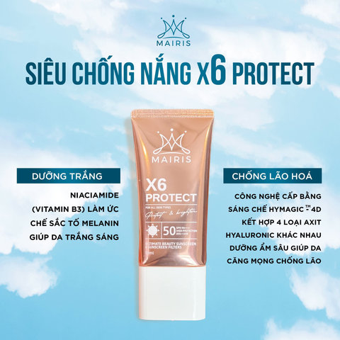 - Kem chống nắng X6 Protect không chỉ là một sản phẩm chống nắng mà còn mang lại nhiều lợi ích vượt trội cho làn da. Với các thành phần chất lượng cao và công thức tiên tiến, X6 Protect đảm bảo cung cấp sự bảo vệ toàn diện, dưỡng ẩm sâu, chống lão hóa và làm sáng da, giúp bạn tự tin với làn da khỏe mạnh, rạng rỡ mỗi ngày.