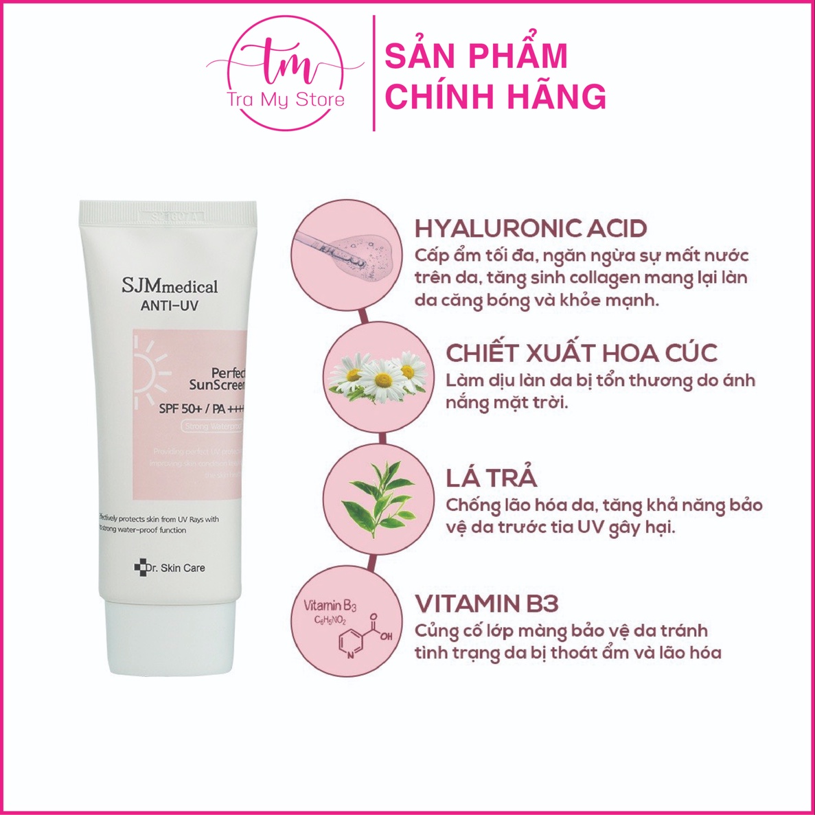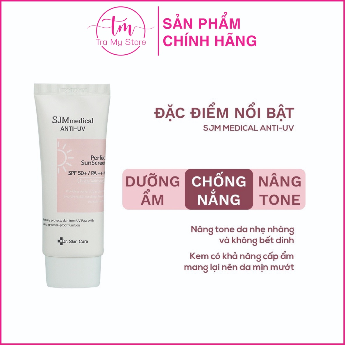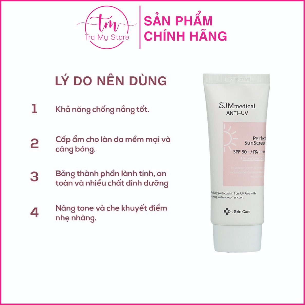 Kem chống nắng SJM Hàn Quốc đến từ thương hiệu mỹ phẩm Dr.SkinCare. Với kết cấu ở dạng tinh chất màng nước trong suốt nên khi apply lên da, kem chống nắng SJM thẩm thấu nhanh, không gây bết dính và mang lại làn da ẩm mịn, mềm mại. Với khả năng nâng tone nhẹ nhàng, hiệu chỉnh màu sắc của da nên có thể dùng kem chống nắng SJM thay thế lớp nền trang điểm.
