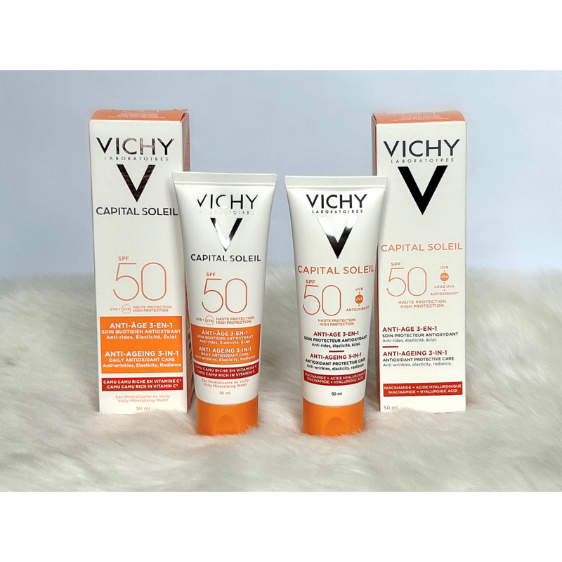 Kem Chống Nắng Vichy Capital Soleil Anti-Ageing 3-In-1 SPF50 là sản phẩm chống nắng da mặt 3 trong 1 mới từ thương hiệu dược mỹ phẩm Vichy, chuyên biệt dành cho làn da lão hoá, nếp nhăn. Công thức sử dụng màng lọc chống nắng tối ưu giúp bảo vệ và ngăn ngừa các dấu hiệu lão hóa sớm trên da do tác động từ tia UV, đồng thời nuôi dưỡng cho làn da khỏe mạnh và tươi trẻ, hỗ trợ cải thiện kết cấu da.