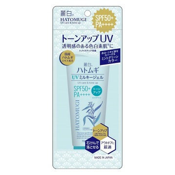 • Kem Chống Nắng Nâng Tông Và Dưỡng Ẩm Da Hatomugi The Tone Up UV Milky Gel UV Care & Tone Up SPF50+ PA++++ (Xanh Bạc Hà) 70g: phù hợp cho da dầu, mụn & nhạy cảm muốn sử dụng kem chống nắng nâng tông, che phủ các khuyết điểm do mụn.
