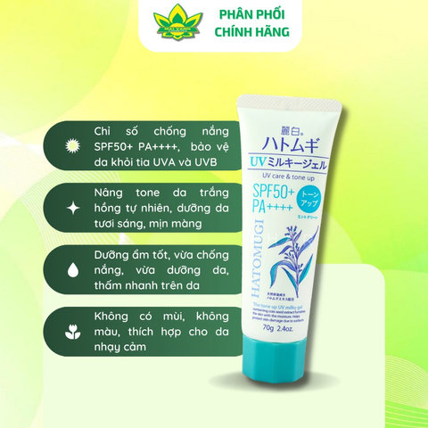 • Kem Chống Nắng Nâng Tông Và Dưỡng Ẩm Da Hatomugi The Tone Up UV Milky Gel UV Care & Tone Up SPF50+ PA++++ 70g: phù hợp cho da thường/ mọi loại da muốn sử dụng kem chống nắng làm sáng, nâng tông da.