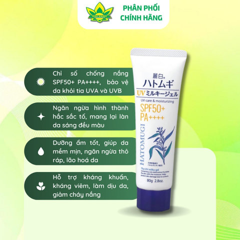 Reihaku Hatomugi UV Milky Gel là dòng sản phẩm kem chống nắng dành cho da mặt và toàn thân đến từ thương hiệu mỹ phẩm Hatomugi của Nhật Bản, giúp bảo vệ làn da khỏi tác hại của tia UVA/UVB, đồng thời dưỡng ẩm và làm sáng da nhờ chiết xuất hạt Ý Dĩ đặc trưng của dòng sản phẩm Hatomugi.