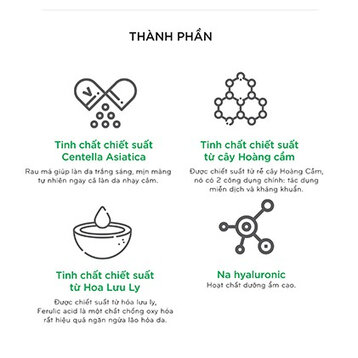 Tinh chất rau má Centella asiatica kích thích tổng hợp callogen nội sinh, giúp da trắng, mịn màng.