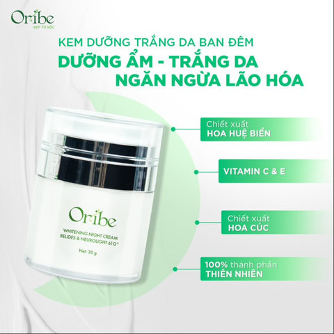 - Với chiết xuất hoa Cúc, chiết xuất hoa Huệ biển, Ceramide và Vitamin C, kem dưỡng trắng da Ori’be giúp dưỡng ẩm, trắng da, chống lão hóa, giảm vết thâm nám, cung cấp dưỡng chất nuôi dưỡng da và kích thích tái tạo tế bào mới vào ban đêm.