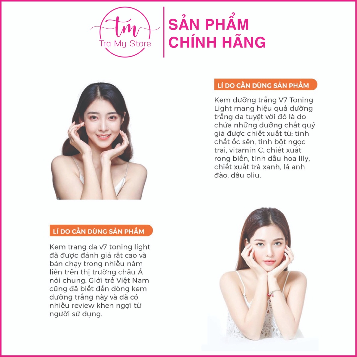 Kem trang da V7 toning light đã được đánh giá rất cao và bán chạy trong nhiều năm liền trên thị trường châu Á nói chung. Giới trẻ Việt Nam cũng đã biết đến dòng kem dưỡng trắng này và đã có nhiều review khen ngợi từ người sử dụng.