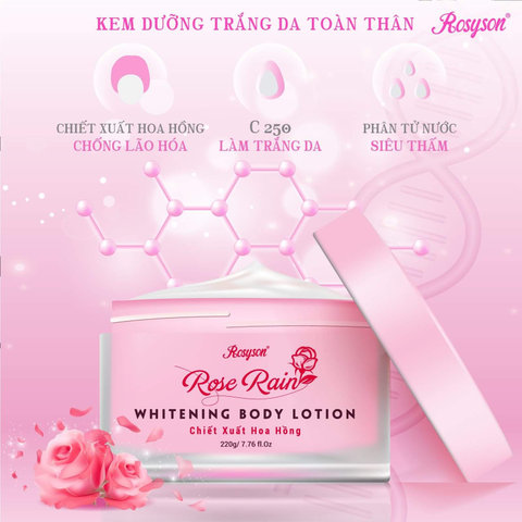 Kem Dưỡng Trắng Da Toàn Thân Rose Rain Whitening Body Lotion đột phá công nghệ dưỡng trắng từ Đức C250 giúp trắng da, đều màu da, cải thiện các vết nám.