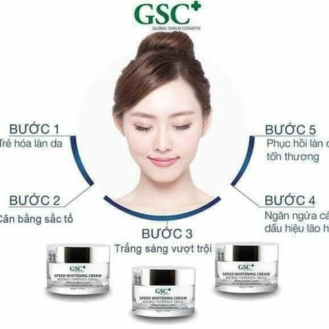 - Với các thành phần Alpha Arbutin, Glyceryl, Niaciamide và chiết xuất rễ cây cam thảo, kem dưỡng trắng GSC Speed Whitening Cream cải thiện sắc tố da đậm màu, giúp làm mờ các đốm nám, tàn nhang, sậm màu. Cung cấp độ ẩm và đồng đều màu da, giúp da ổn định, mềm mịn, trắng sáng.