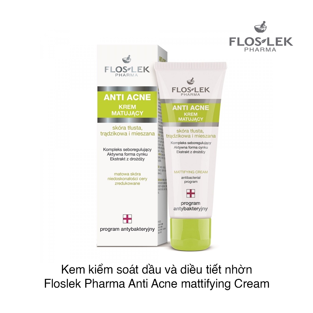 Kem Kiểm Soát Dầu Và Diều Tiết Nhờn Floslek Anti Acne Mattifying Cream có chứa kẽm hoạt tính. Sẽ điều chỉnh quá trình hoạt động của tuyến bã nhờn, ngăn chặn lượng bã nhờn tiết ra quá nhiều trên da. Đồng thời, thâm nhập sâu vào lỗ chân lông để giảm thiểu hoàn toàn các chất cặn bẩn, tế bào chết và bã nhờn kết dính bên trong da. Giúp ngăn ngừa và tiêu diệt các vi khuẩn để giảm nguy cơ hình thành mụn. Panthenol từ thành phần kem sẽ thúc đẩy chu trình quá trình tái tạo tế bào da mới, khôi phục làn da tươi trẻ. Đồng thời, làm giảm các vết sưng viêm do mụn gây ra, làm se khô và đẩy nhân mụn. Niacinamide có tính kháng viêm mạnh mẽ, sẽ kiểm soát dầu nhờn, tống khứ hoàn toàn các chất bụi bẩn, tế bào chết và bã nhờn kết dính trong lỗ chân lông, ngăn ngừa và diệt khuẩn để giảm mụn hiệu quả. Không những thế, niacinamide còn dưỡng ẩm cho làn da mềm mại, tăng kích thích các sợi collagen và elastin cho da săn chắc, ngăn chặn quá trình lão hóa da.