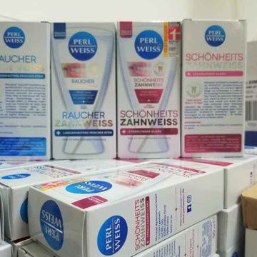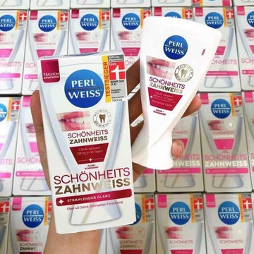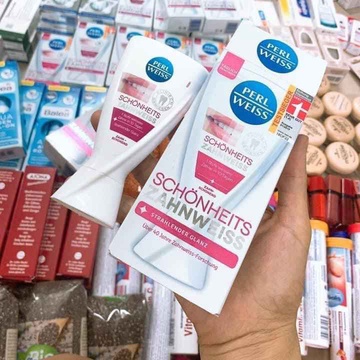 - Kem đánh răng Perl Weiss (màu hồng) làm trắng răng, loại bỏ các mảng bám, ố vàng trên răng. Với công thức White Pearl Powder Schonheits giúp nhẹ nhàng loại bỏ mảng bám và sự đổi màu của răng, giúp tẩy trắng răng một cách tự nhiên và an toàn. Đảm bảo răng trắng lên sau mười ngày sử dụng.