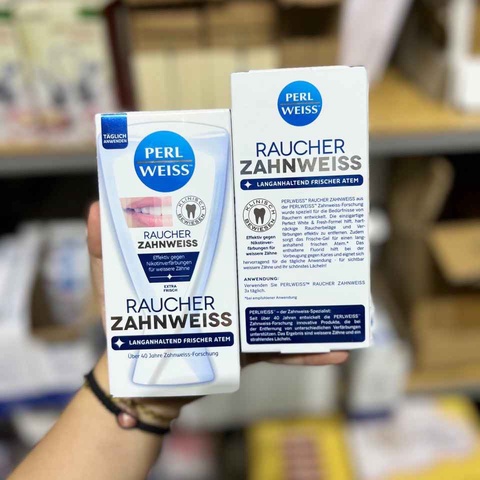 - Kem đánh trắng răng Perl Weiss Raucher (màu xanh) dành cho người hút thuốc, uống trà, cà phê giúp loại bỏ các mảng bám, ố vàng trên răng. Công thức thức đặc biệt chống lại sự làm đổi màu răng do chất ni-cotine. Giúp răng trắng bóng và hơi thở thơm mát lâu dài.
