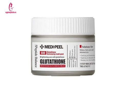 - Kem Dưỡng Trắng Da Medi-Peel Bio-Intense Glutathion 600 White Cream với thành phần chính là hoạt chất Glutathione kết hợp với Niacinamide là một thành phần dưỡng trắng nổi bật có khả năng ức chế Melanin và giúp loại bỏ nhanh chóng đốm nâu đồi mồi, giúp làm sáng làn da bị cháy nắng và cải thiện tình trạng nám da một cách hiệu quả.