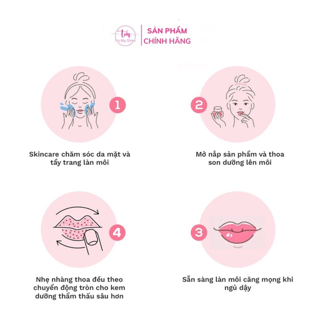 Trước khi ngủ, thoa một lượng nhiều lên môi để đánh tan các tế bào da chết cứng đầu. Cung cấp nguồn độ ẩm dồi dào cho da qua cả đêm.
