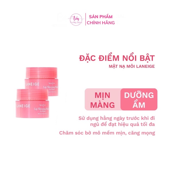 Mặt nạ môi Laneige Lip Sleeping Mask có tên gọi khác là mặt nạ ngủ cho môi. Với công nghệ độc quyền của laneige, sản phẩm giống sáp nhưng không dính chứa nhiều vitamin C, độ ẩm cao làm giảm da khô bong, dưỡng ẩm cho đôi môi luôn căng mọng.