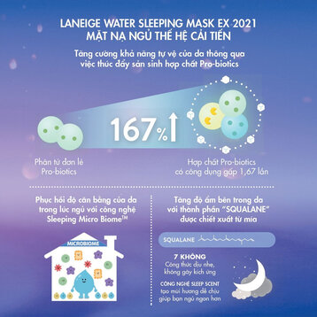 Dành cho cô nàng có làn da mệt mỏi do bận rộn, thường xuyên thức khuya và thiếu ngủ, Mặt Nạ Ngủ Phiên Bản Cải Tiến LANEIGE Water Sleeping Mask_EX Mới mang đến giấc ngủ ngon, nuôi dưỡng làn da suốt đêm dài đồng thời giúp tăng khả năng tự vệ với công nghệ Sleeping Micro Biome™ (cân bằng hệ vi sinh trong lúc ngủ) và hợp chất Pro-biotics (lợi khuẩn). Làn da được nuôi dưỡng chuyên sâu, mang đến cho nàng vẻ ngoài thật ẩm mượt, rạng rỡ và căng tràn sức sống chỉ sau một đêm.