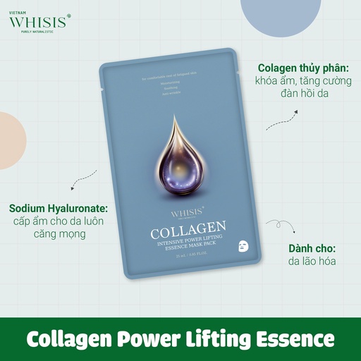 - Mặt nạ WHISIS Intensive Collagen Power Lifting Essence Mask Pack chứa Collagen thủy phân khóa ẩm, phục hồi, tăng cường tái tạo cho da trẻ khỏe.