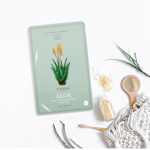 - Mặt nạ WHISIS Aloe Super Moisture Essence Mask Pack chứa tinh chất nhụy hoa lô hội giúp cấp, giữ ẩm, làm dịu tổn thương trên da.