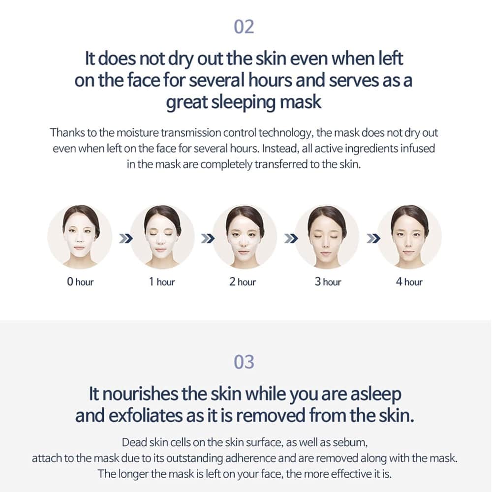 Thành phần chính ECM và phức hợp acid amin, adenosine, dưỡng ẩm chuyên sâu, cải thiện tông, làm đầy da. Với mask này, bạn sẽ thư giãn ít nhất 4 tiếng, hoặc để qua đêm mà không sợ bị thấm hút trở lại. Nó sẽ chỉ càng giúp da hút dưỡng chất từ mặt nạ, mà không có cơ chế ngược lại.