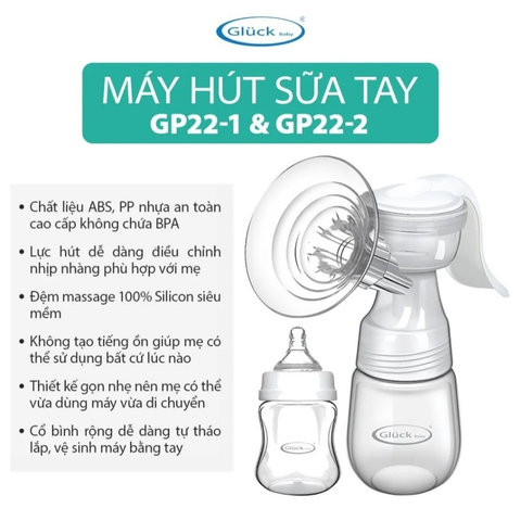 Máy hút sữa bằng tay GP22-2 Gluckbabyvn là sản phẩm uy tín và chất lượng. Một bộ máy hút sữa bằng tay Gluckbabyvn GP22-2 gồm có 2 loại bình cổ rộng và cổ hẹp, giúp việc trữ sữa cho bé được dễ dàng và thuận tiện hơn.