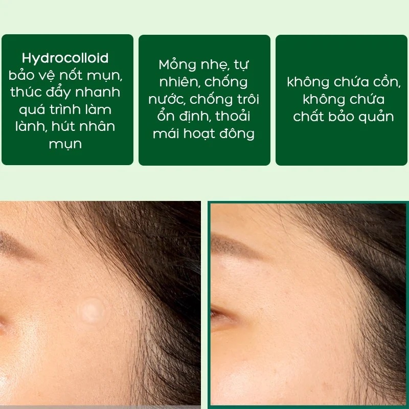- Kích thước miếng dán mỏng và độ bám dính tốt giúp bảo vệ nốt mụn trước những tác động từ môi trường bên ngoài trong suốt nhiều giờ.