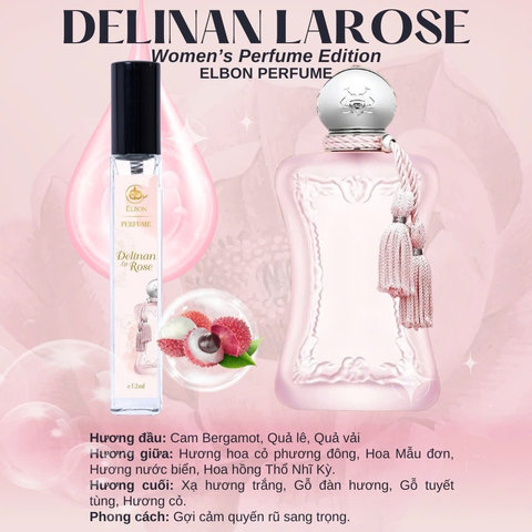 Delinan larose là trọn vẹn tinh hoa thể hiện sự trang nghiêm và phong thái vương giả cho làn da phái đẹp. Giống như đóa hoa mỏng manh bị khóa trong chiếc váy mỏng manh, mỗi chuyển động trên cơ thể cô đều toát ra sự ngọt ngào mềm mại. Hương thơm ấm áp của hoa hồng hòa quyện với hương trái cây, cam quýt và hương hoa của cam bergamot, lê và vải thiều để gợi lên sự rõ ràng. Một cách chậm rãi, hoa hồng Thổ Nhĩ Kỳ trong Delinan Larose được kết hợp với lớp hương cuối là gỗ và hổ phách, mềm mại và quyến rũ, sang trọng và dường như đang ở hoặc gần cao trào. Cô ấy xinh đẹp, xinh đẹp và vẻ đẹp của cô ấy có thể khiến bạn bị mê hoặc bởi những hình ảnh động cực kỳ nhẹ trên làn da của cô ấy.