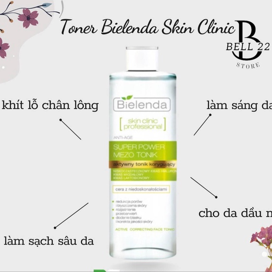 Toner Bielenda Skin Clinic Professional cải thiện hiệu quả chất lượng Da - hỗn hợp, Nhờn, Xỉn màu với lỗ chân lông to, Mụn trứng cá .Nhẹ nhàng tẩy tế bào chết, làm sáng da, Giảm thâm sẹo và thắt chặt lỗ chân lông, giúp da Trắng hồng hào, rạng rỡ. Nó làm giảm nếp nhăn, làm mịn, mướt và săn chắc da, ngăn ngừa chảy xệ.Toner Bielenda Skin Clinic Professional giúp làm sạch sâu Da, làm mới Da. Giảm các nếp nhăn, kích thích tái tạo Da, cân bằng độ ẩm cho Da, giảm độ kích ứng của Da, se khít lỗ chân lông.Phân tử Hyaluronic Acid - hình thức mới nhất và hiệu quả nhất một thành phần giữ ẩm mạnh, các phân tử có khả năng thâm nhập vào các lớp sâu của Da, Da được giữ ẩm từ sâu bên trong giúp Da mịn mà, săn chắc, đàn hồi tốt hơn.