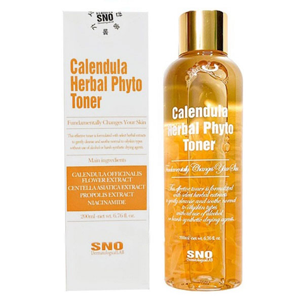Nước Hoa Hồng Hoa Cúc SNO Calendula Herbal Phyto Toner là dòng nước hoa hồng có chứa hơn 90% thành phần thiên nhiên như chiết xuất hoa cúc Calendula, chiết xuất cúc la mã, niacinamide, adennosine… Trong đó, thành phần chiết xuất từ hoa cúc Calendula có vai trò giữ ẩm, giúp làm dịu da nhanh chóng và giảm thiểu tình trạng kích ứng trên da.